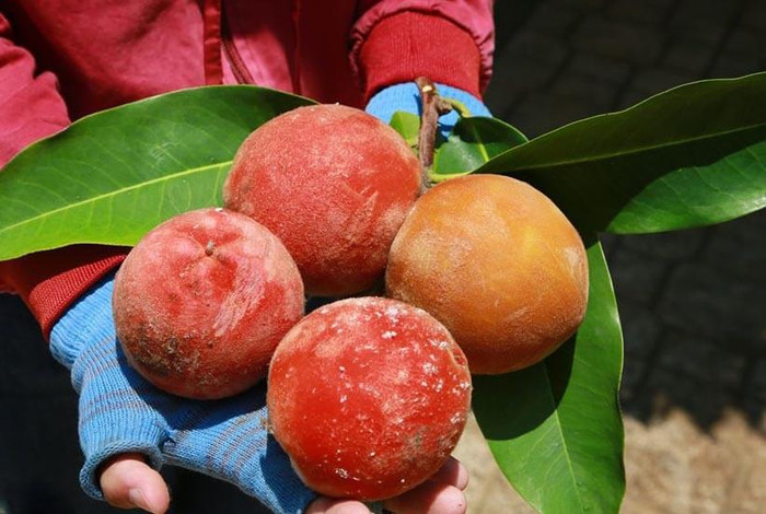 Hồng nhung nhìn khá giống đào, vỏ ngoài đỏ tươi, phủ lớp lông mịn trắng. (Ảnh minh họa từ Internet)
