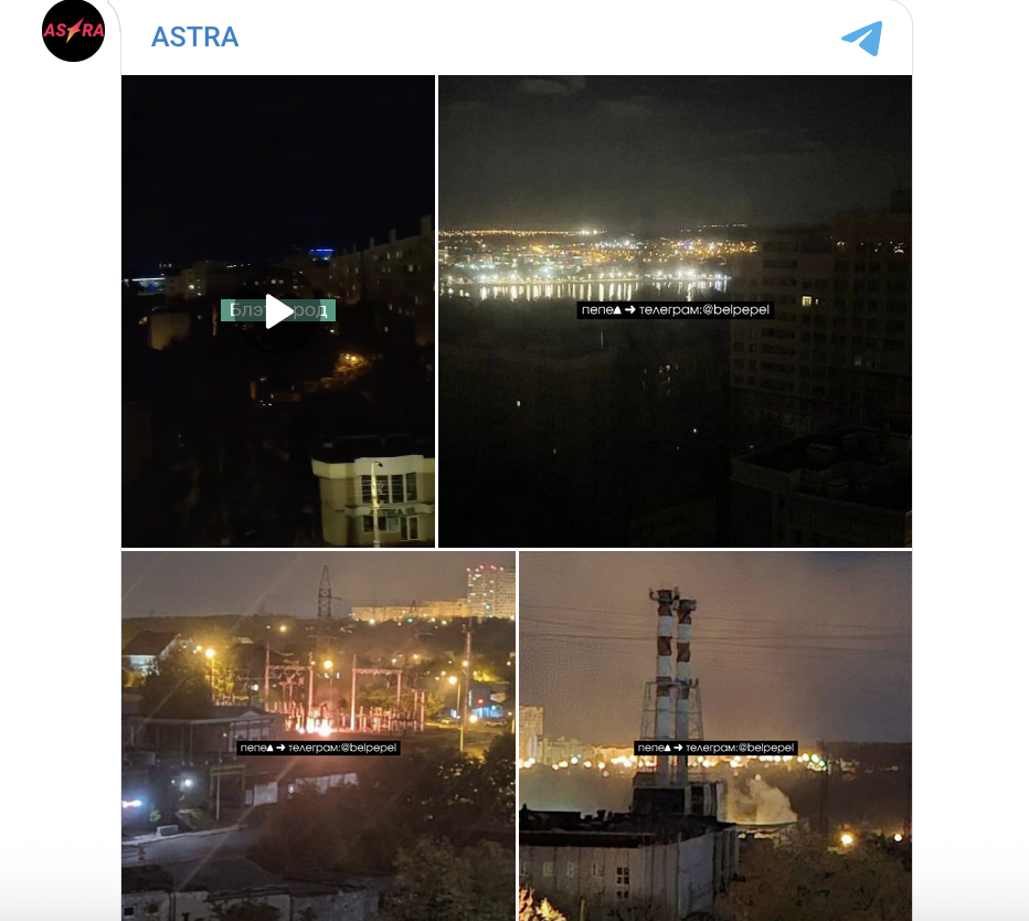 Kênh truyền thông Astra đưa tin về vụ tấn công của Ukraine gây mất điện ở thành phố Belgorod. Ảnh chụp màn hình Astra/Telegram