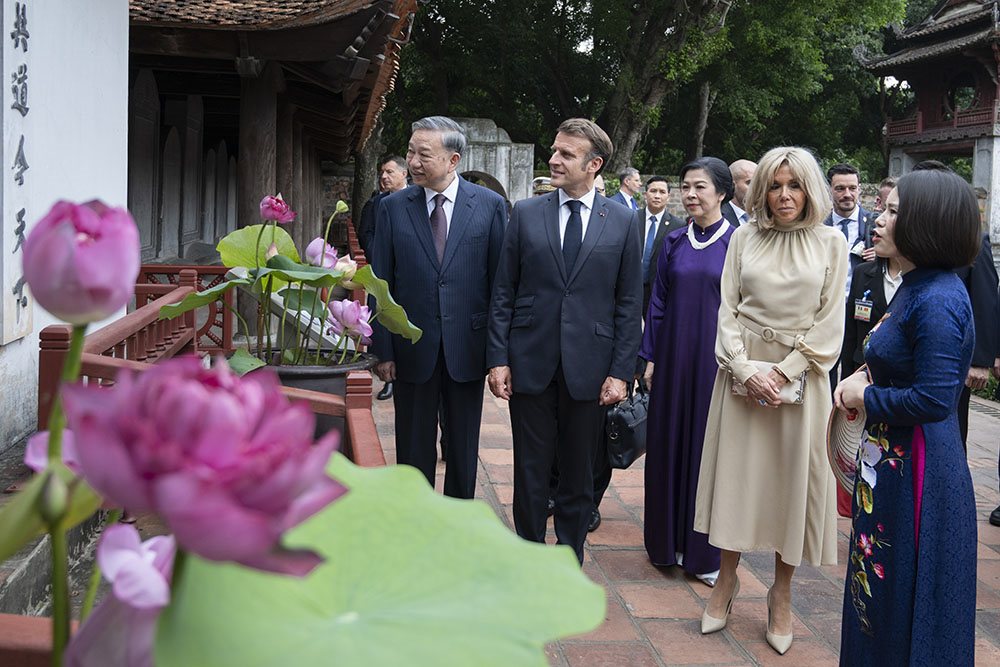 Tổng Bí thư Tô Lâm và phu nhân cùng Tổng thống Pháp Emmanuel Macron và phu nhân thăm Văn Miếu - Quốc Tử Giám, Hà Nội (tháng 5-2025). Ảnh: VŨ PHONG
