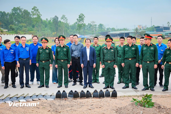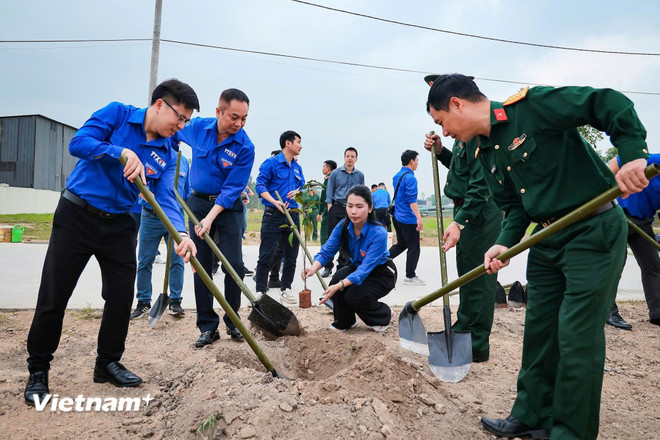 Đại tá Đinh Khắc Hùng, Ủy viên Đảng ủy, Sư đoàn trưởng Sư đoàn 304; Phó Bí thư Thường trực Đảng ủy, Phó Tổng giám đốc TTXVN Nguyễn Tuấn Hùng; và các đoàn viên, thanh niên hai cơ quan, đơn vị tham dự lễ trồng cây xanh. (Ảnh: Hoài Nam/Vietnam+)