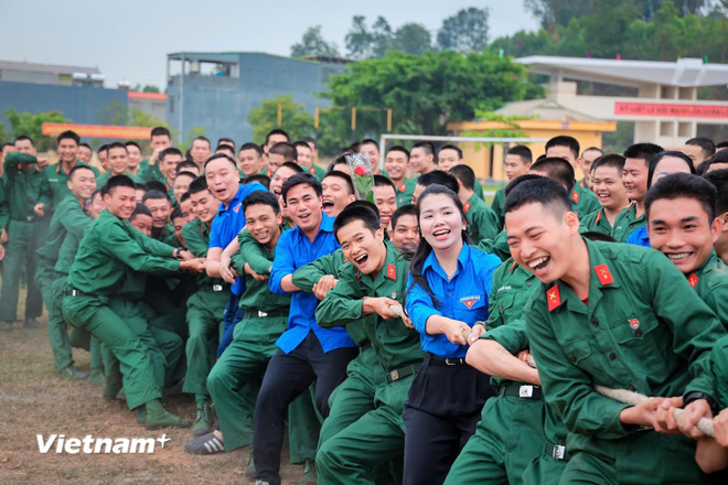 Các đoàn viên, thanh niên TTXVN và Trung đoàn 24 cùng tham gia kéo co tại chương trình. (Ảnh: Hoài Nam/Vietnam+)