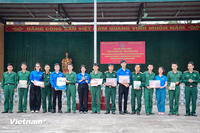 Các đoàn viên, thanh niên TTXVN và Trung đoàn bộ binh 24 cùng chụp ảnh lưu niệm. (Ảnh: Hoài Nam/Vietnam+)