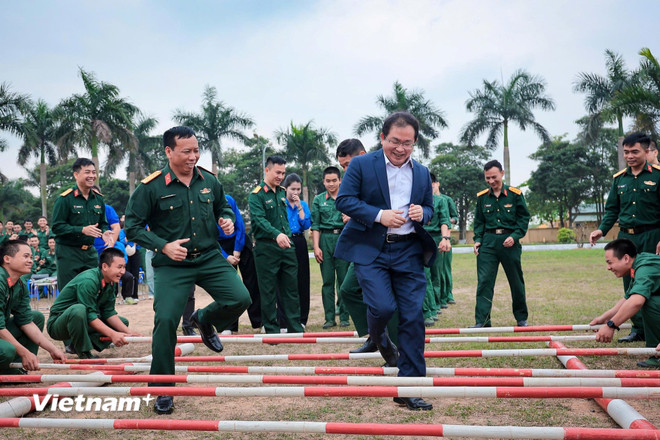 Đại tá Đinh Khắc Hùng, Ủy viên Đảng ủy, Sư đoàn trưởng Sư đoàn 304; Phó Bí thư Thường trực Đảng ủy, Phó Tổng giám đốc TTXVN Nguyễn Tuấn Hùng; và các đoàn viên, thanh niên hai cơ quan, đơn vị nhảy sạp tại chương trình. (Ảnh: Hoài Nam/Vietnam+)