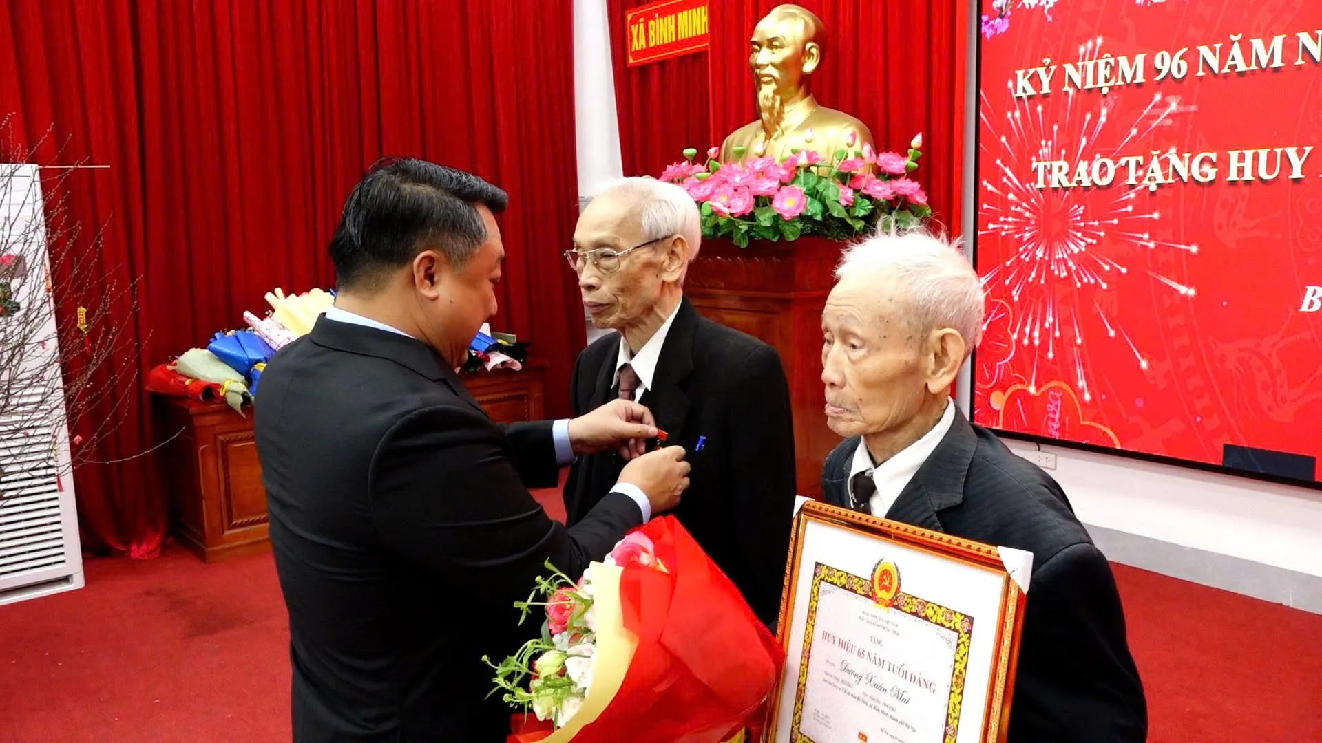 Chủ tịch UBND xã Bình Minh Nguyễn Đăng Việt trao Huy hiệu Đảng tới các đảng viên.