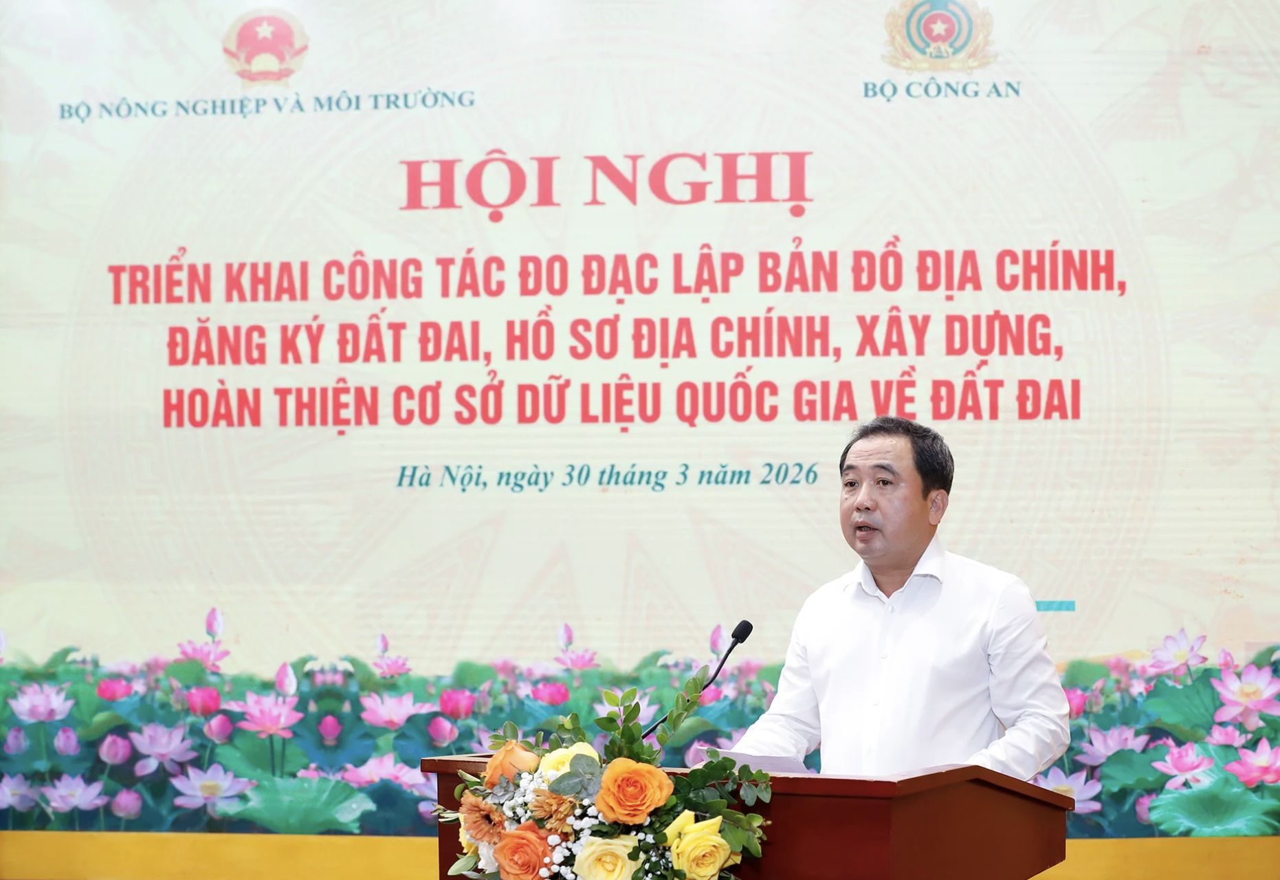 Bộ trưởng Bộ Nông nghiệp và Môi trường Trần Đức Thắng phát biểu khai mạc Hội nghị Triển khai công tác đo đạc, lập bản đồ địa chính, đăng ký đất đai, lập hồ sơ địa chính và xây dựng, hoàn thiện cơ sở dữ liệu quốc gia về đất đai.