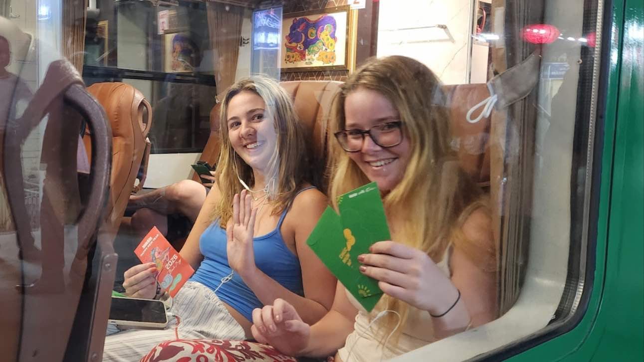 Trong số 450 hành khách có nhiều du khách nước ngoài chọn đón giao thừa trên đường ray Bắc - Nam. Với họ, đây là trải nghiệm đặc biệt khi được hòa mình vào không khí tết Việt ngay trên tàu hỏa.