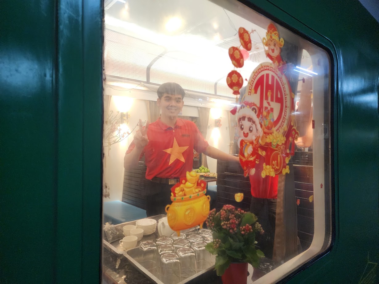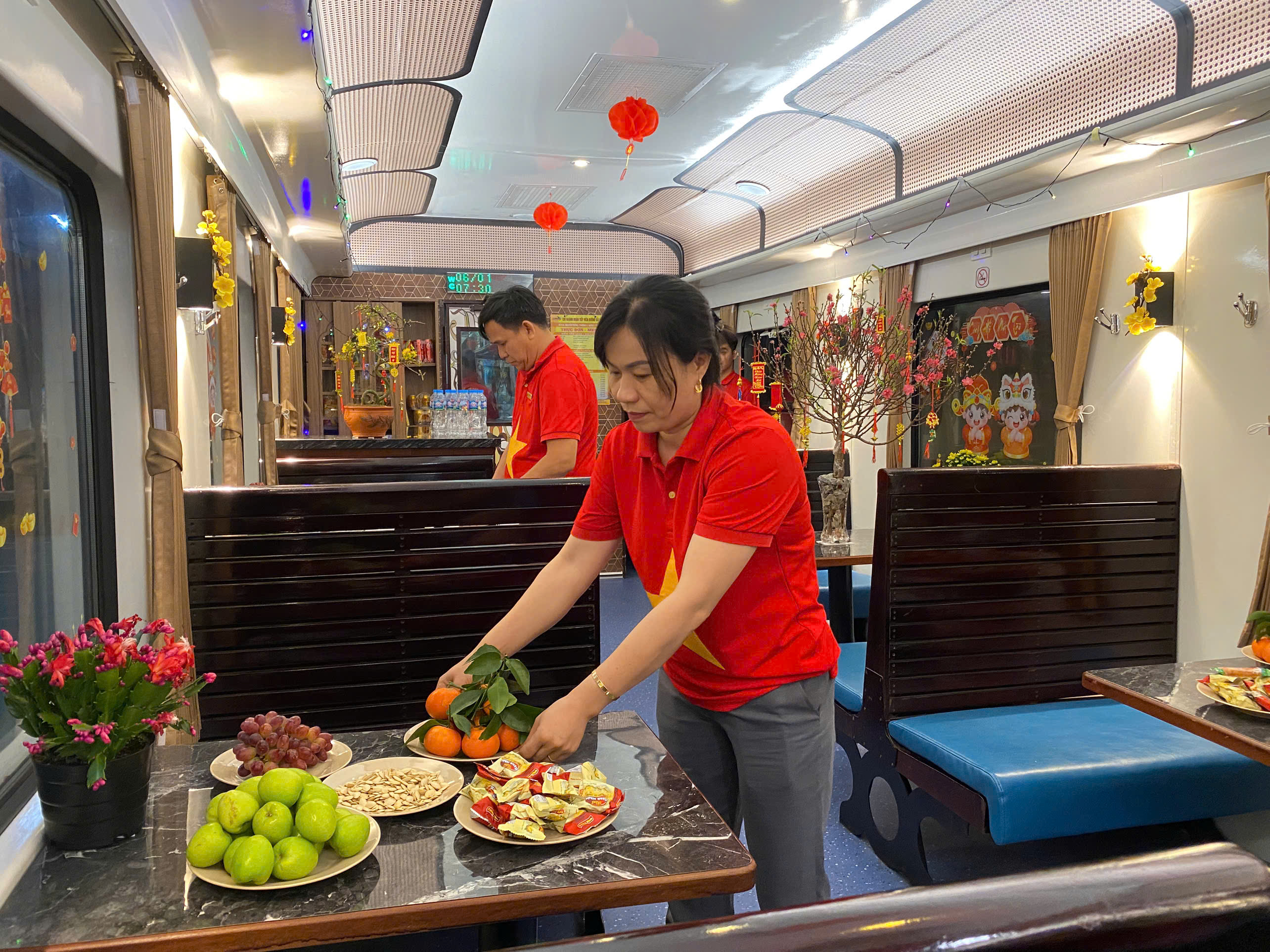 Nhân viên của tàu SE3 đang chuẩn bị không gian đón xuân trên tàu cho hành khách
