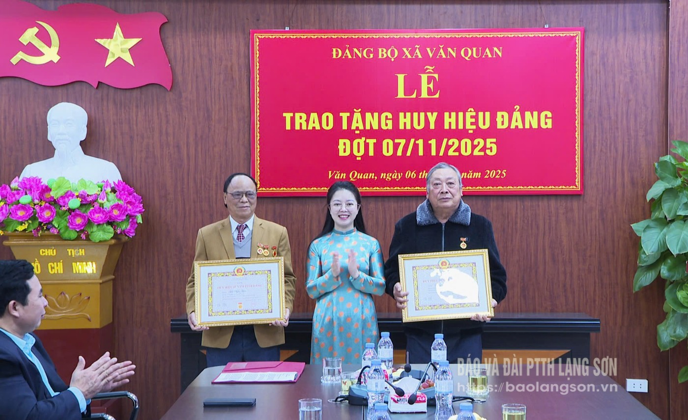 Lãnh đạo Đảng ủy xã Văn Quan trao tặng Huy hiệu Đảng cho các đảng viên