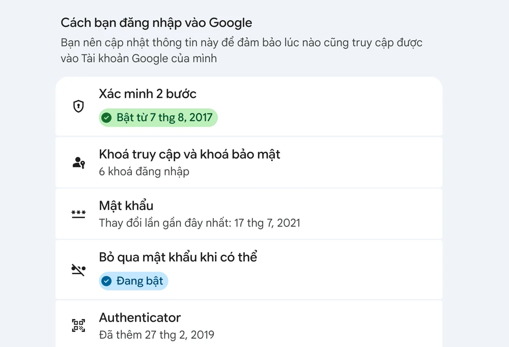Tiếp theo, người dùng nên bật tính năng xác thực hai bước trong phần cài đặt tài khoản https://myaccount.google.com/security để tăng thêm một lớp bảo vệ. Trong trường hợp thông tin đăng nhập bị lộ, lớp xác thực này có thể ngăn chặn việc đăng nhập trái phép từ thiết bị lạ.