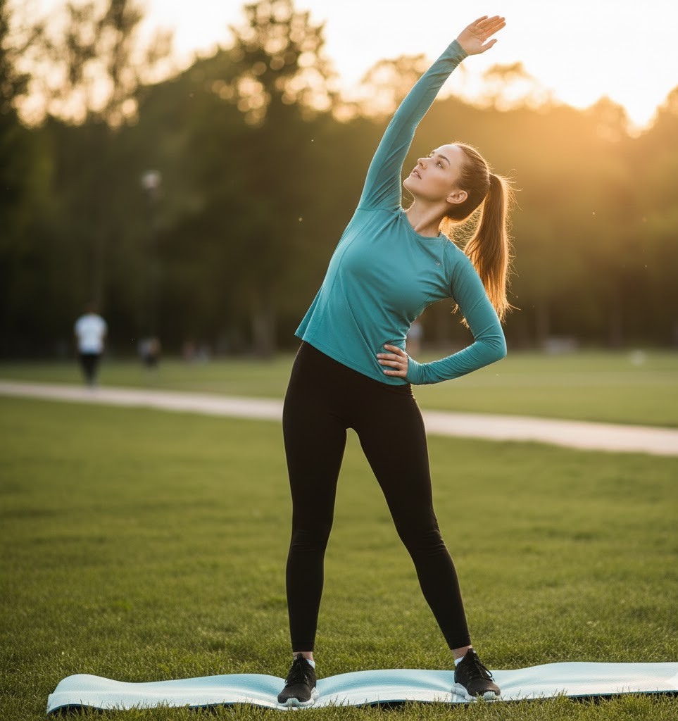 Các động tác vươn chéo thân giúp tăng nhịp tim, hỗ trợ đốt mỡ và định hình vòng eo hiệu quả.