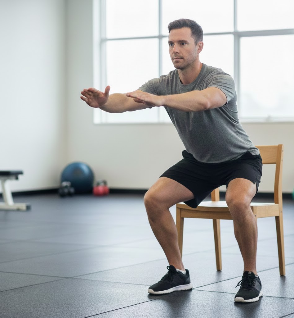 Bài tập squat kích hoạt các nhóm cơ lớn, rất cần thiết cho việc giảm mỡ. Sử dụng ghế để kiểm soát nhịp điệu và độ sâu giúp bạn luyện tập đều đặn hàng ngày mà không gây kích ứng khớp. Các bài tập squat lặp đi lặp lại, có kiểm soát giúp tăng cường trao đổi chất đồng thời củng cố các động tác đúng cách.