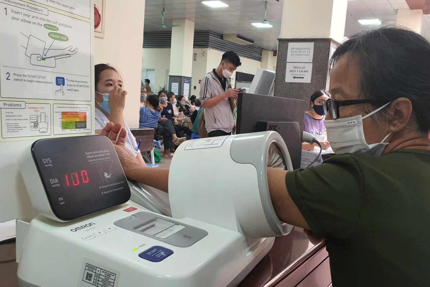 Đo huyết áp cho bệnh nhân tại Bệnh viện Bạch Mai. Ảnh: Minh An