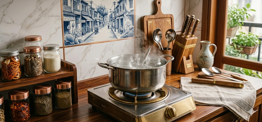 Nên luộc tất cả hũ thủy tinh và thìa khuấy qua nước sôi.
