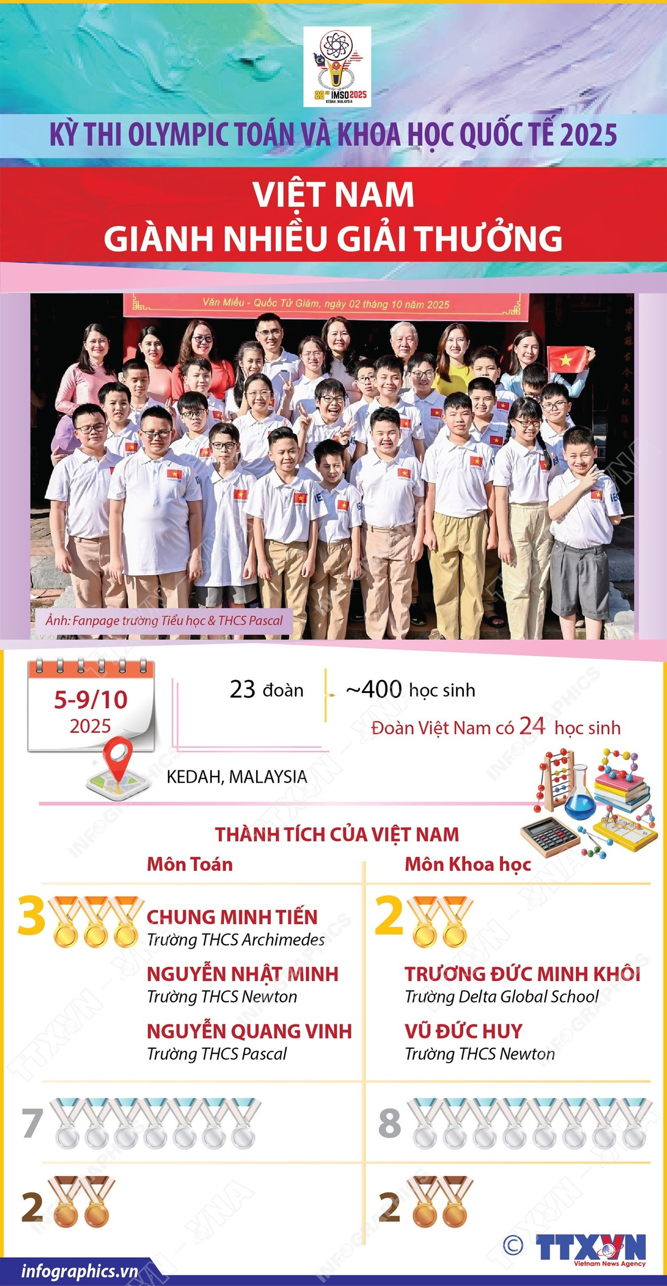 Kết quả ở môn Toán, đoàn Việt Nam đạt 3 huy chương Vàng. Kết quả môn Khoa học, các học sinh Việt Nam đạt 2 huy chương Vàng./.