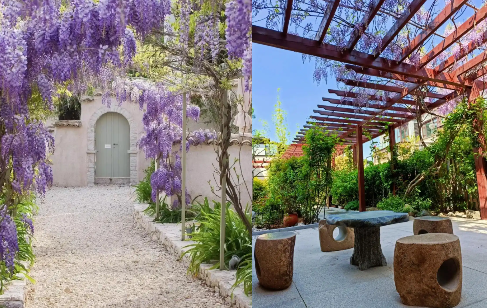 Cây tử đằng với chùm hoa tím buông rủ tạo khung cảnh lãng mạn và mềm mại. Ảnh: Baidu