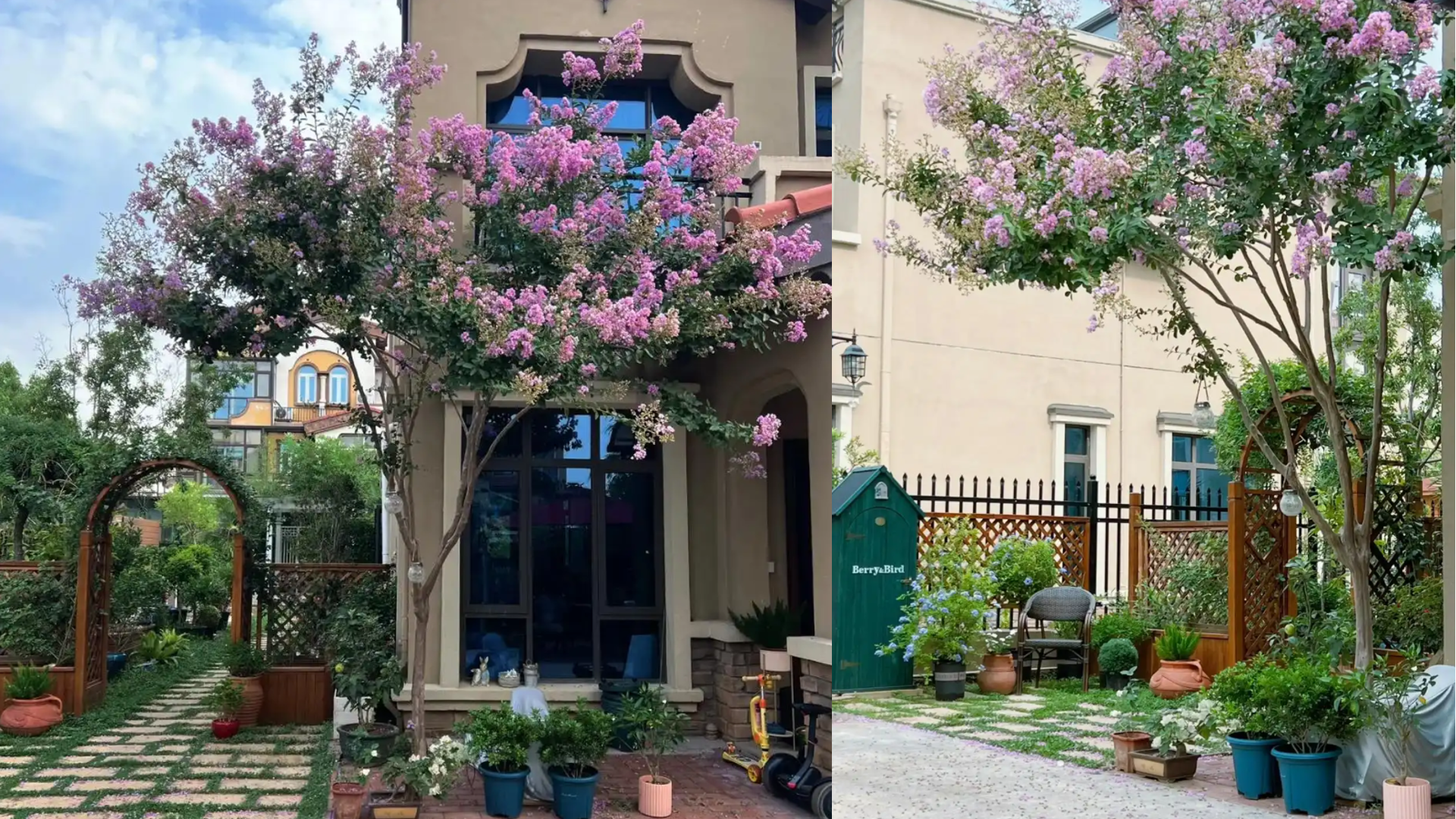 Cây tử vi nở hoa rực rỡ, thân uốn lượn tự nhiên, biểu tượng vượng khí và quý nhân phù trợ. Ảnh: Baidu