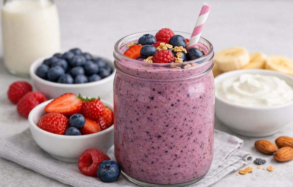 Sinh tố từ các loại quả mọng kết hợp với sữa chua Hy Lạp là một lựa chọn phổ biến nhờ hàm lượng protein và chất chống oxy hóa cao. Thành phần có thể gồm dâu tây, việt quất, chuối chín, sữa chua Hy Lạp và một ít sữa hạnh nhân. Khi xay nhuyễn, hỗn hợp tạo thành một thức uống sánh mịn, giàu dinh dưỡng.
