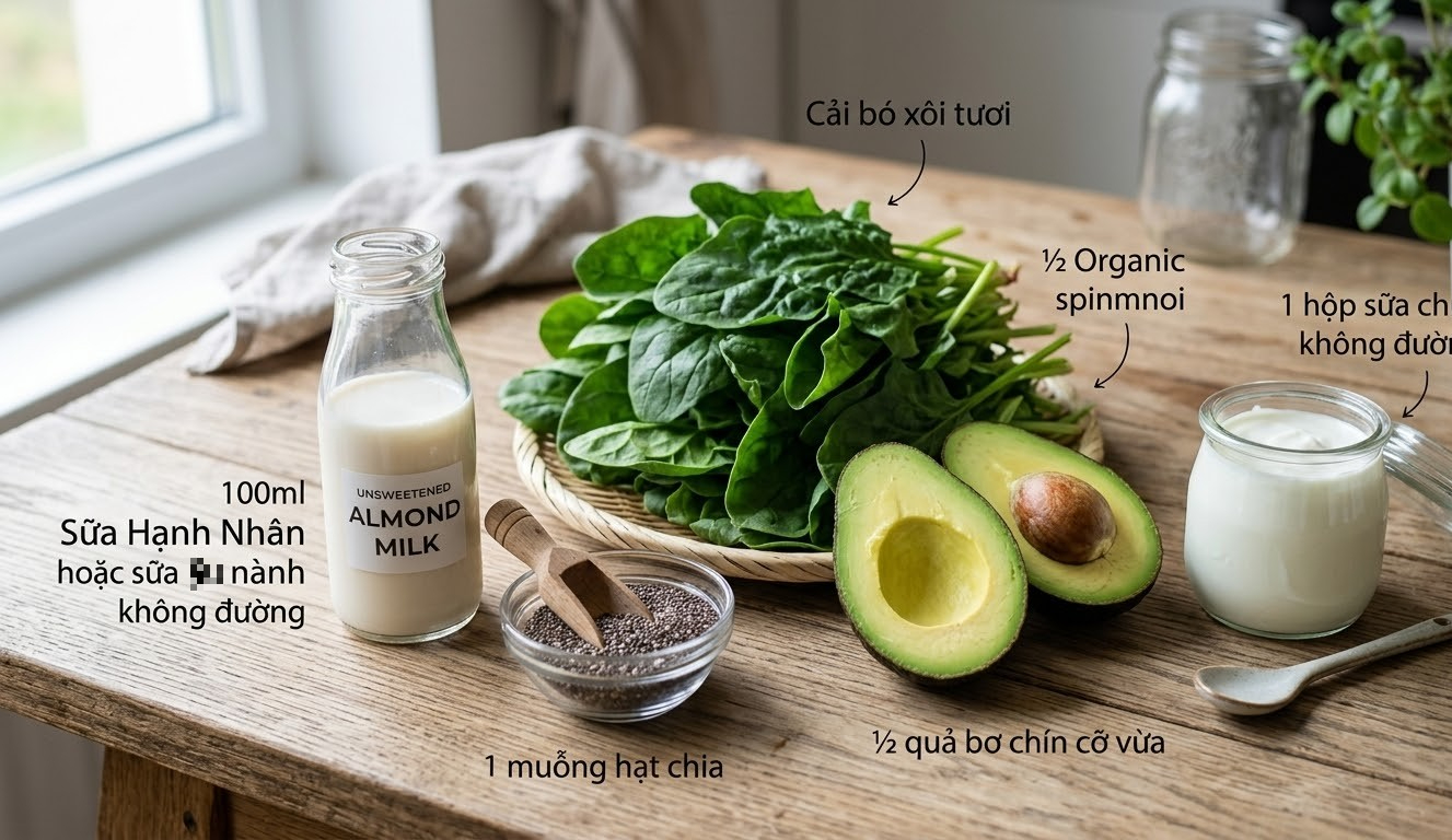 Nguyên liệu: 1 nắm cải bó xôi tươi + ½ nửa quả bơ chín cỡ vừa + 1 hộp sữa chua không đường + 1 muỗng hạt chia + 100 ml sữa hạnh nhân hoặc sữa đậu nành không đường.