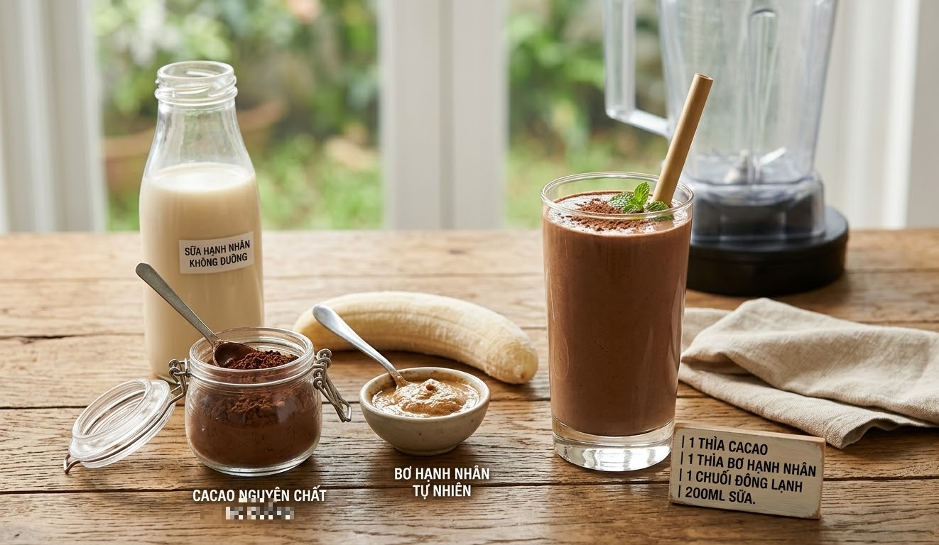 Nguyên liệu: 1 thìa bột cacao nguyên chất (không đường) + 1 thìa bơ đậu phộng hoặc bơ hạnh nhân tự nhiên + 1 quả chuối đông lạnh + 200 ml sữa hạnh nhân không đường.