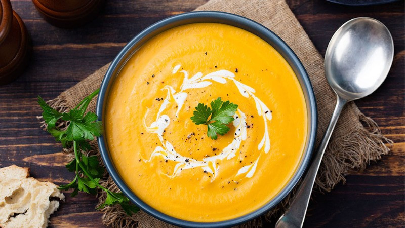 Đừng bỏ qua món súp bí đỏ ngọt thơm, đẹp da, sáng mắt. Bí đỏ là nguyên liệu vàng của mùa thu – đông, chứa nhiều beta-caroten giúp sáng mắt và làm đẹp da. Khi nấu cùng sữa tươi hoặc kem, súp bí đỏ có hương vị béo nhẹ, mịn mượt và phù hợp với cả trẻ nhỏ lẫn người lớn tuổi. Một lát bánh mì giòn ăn kèm sẽ khiến món ăn thêm trọn vị, đủ no mà vẫn nhẹ bụng – rất thích hợp cho bữa sáng hoặc tối trong những ngày se lạnh. Ảnh minh họa