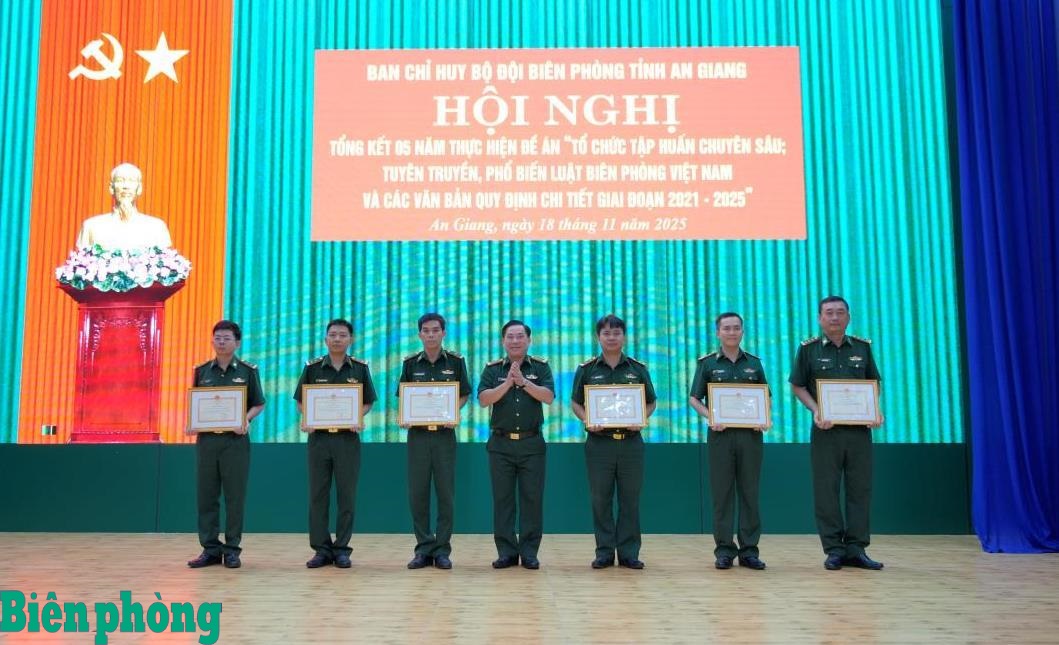 Đại tá Nguyễn Văn Hiệp, Chính ủy Ban Chỉ huy BĐBP tỉnh An Giang trao giấy khen của Ban Chỉ huy cho các tập thể có thành tích xuất sắc trong triển khai thực hiện Đề án. Ảnh: Tiến Vinh