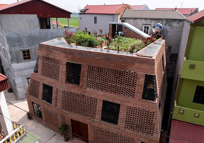 Một ngôi nhà với mặt tiền là những thửa ruộng bậc thang xanh mướt đã được thiết kế tại Hà Tĩnh, như một giải pháp kiến trúc - nông nghiệp bền vững. Công trình "Tổ Ấm Ruộng" có diện tích 110m², sở hữu chín bậc thang trồng rau và hoa ngay mặt tiền, vừa cung cấp thực phẩm vừa giúp điều hòa vi khí hậu. Các không gian sinh hoạt được bố trí thông minh, tận dụng ánh sáng tự nhiên xuyên qua các khay trồng rau. Thiết kế này không chỉ tạo cảnh quan độc đáo mà còn mang lại trải nghiệm sống gần gũi với thiên nhiên cho cư dân đô thị.