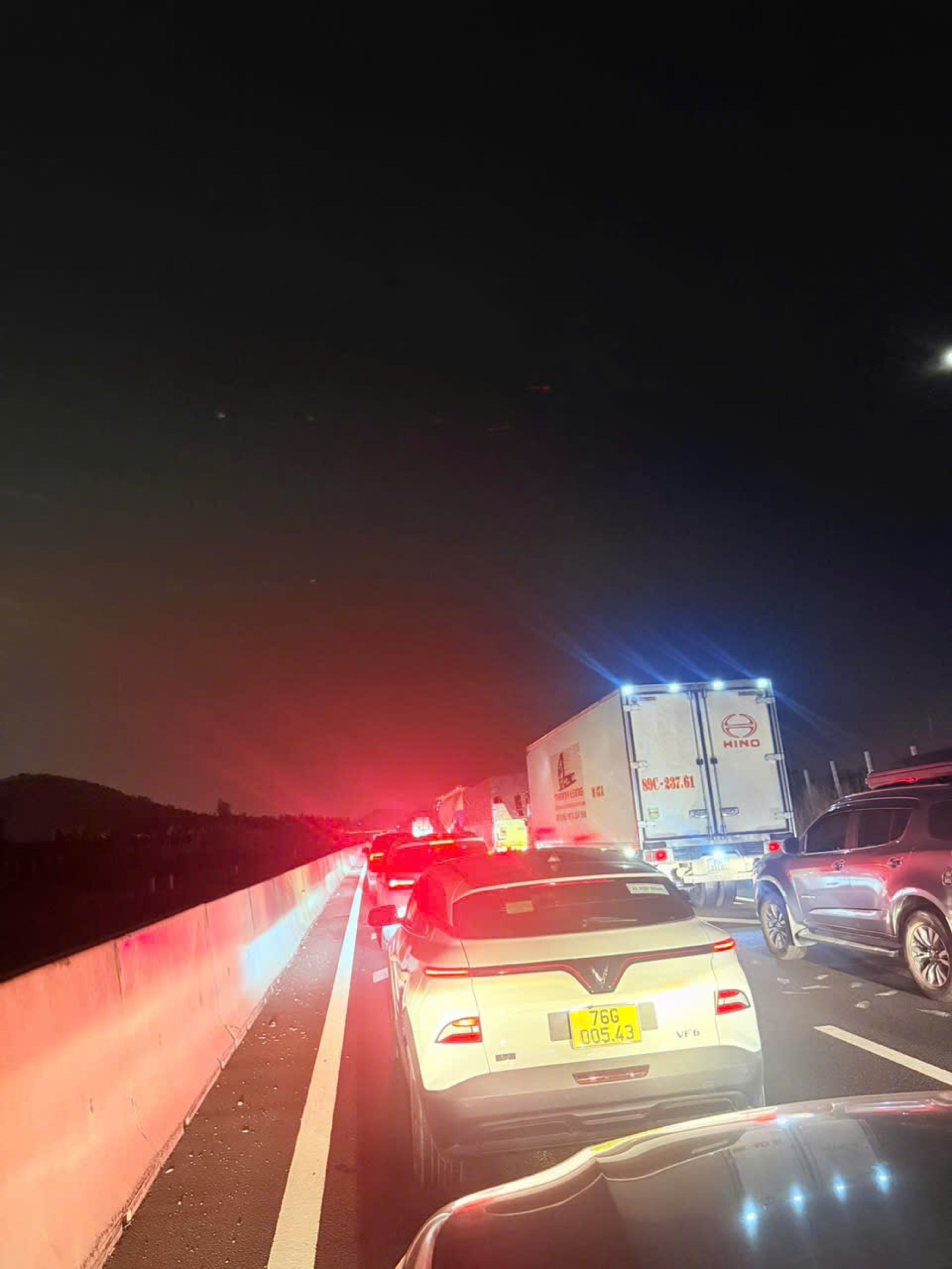 Vụ tai nạn khiến các xe dừng trên làn gần dải phân cách, có xe chắn giữa mặt đường, làm dòng xe qua khu vực phải giảm tốc, ùn tắc kéo dài nhiều km.