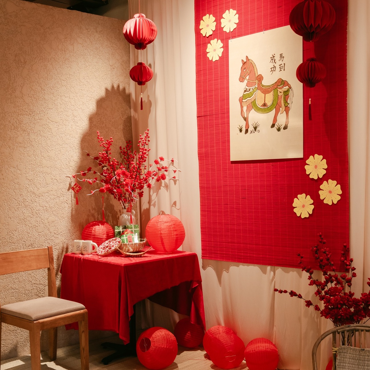 Dịp Tết, quán trang trí vừa đủ bằng hoa tươi và vài điểm nhấn sắc đỏ để có không khí đầu năm nhưng vẫn giữ tinh thần tối giản.