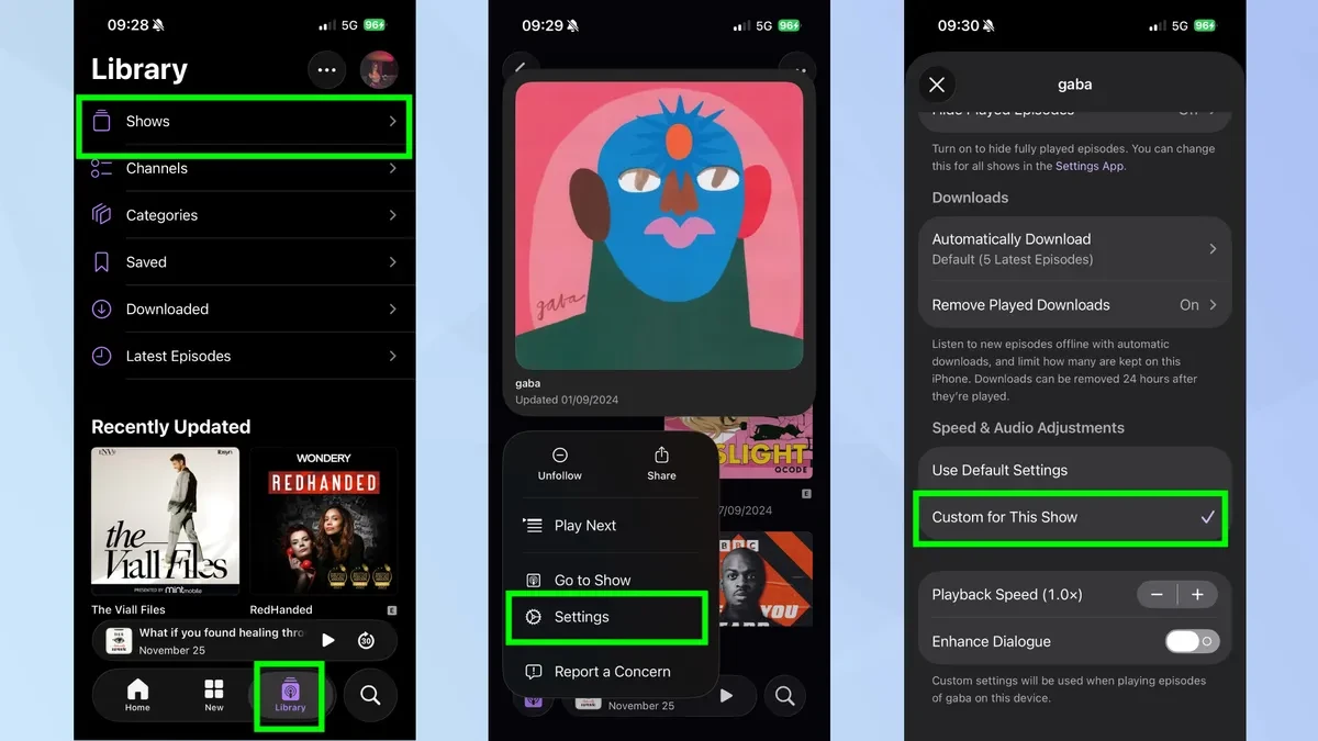 Trong ứng dụng Podcast, vào mục Thư viện > Chương trình. Nhấn và giữ vào chương trình muốn tùy chỉnh, sau đó chọn Cài đặt. Tại đây, người dùng có thể bật tùy chọn Sử dụng Điều chỉnh Tùy chỉnh cho Chương trình này và thiết lập theo ý muốn. Hệ thống sẽ tự động áp dụng các cài đặt này cho tất cả các tập của chương trình đó.