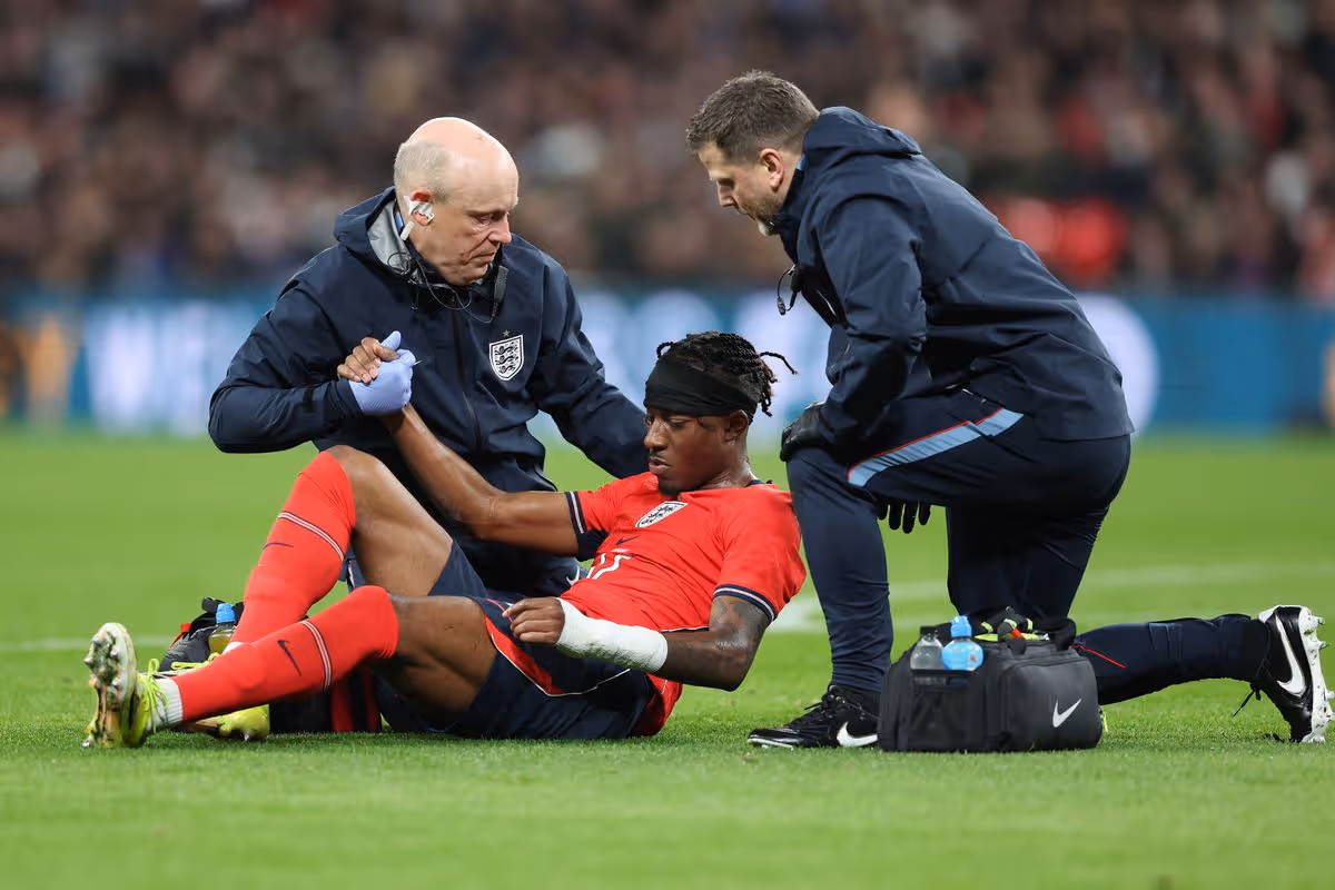 Noni Madueke chấn thương khi chơi cho tuyển Anh. ẢNH: CAMERASPORTS