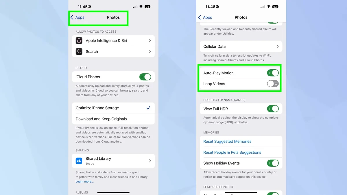 Để thay đổi, hãy truy cập vào Cài đặt, chọn mục Ảnh và tìm đến tùy chọn Lặp Lại Video (Loop Videos). Bằng cách tắt tính năng này, video sẽ chỉ phát một lần và dừng lại. Ngoài ra, người dùng cũng có thể tắt Tự Động Phát Chuyển Động (Auto-Play Motion) để ngăn video tự động phát khi duyệt qua thư viện.