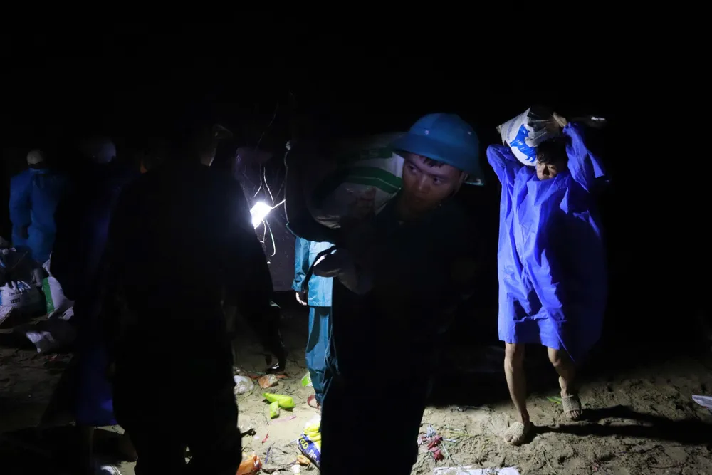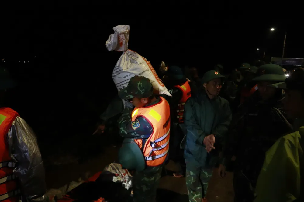 Bộ đội cùng người dân mang từng bao cát gia cố bờ kè.