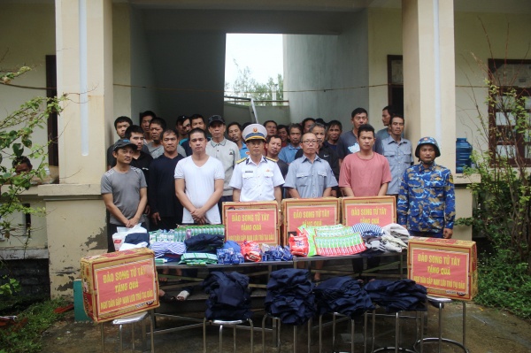 52 ngư dân được Bộ đội hải quân trên đảo Song Tử Tây tặng quần áo, vât dụng sinh hoạt, bố trợ nơi nghỉ ngơi, ăn uống trong thời gian chờ trở về đất liền. Ảnh: Châu Vũ - gửi về từ đặc khu Trường Sa.
