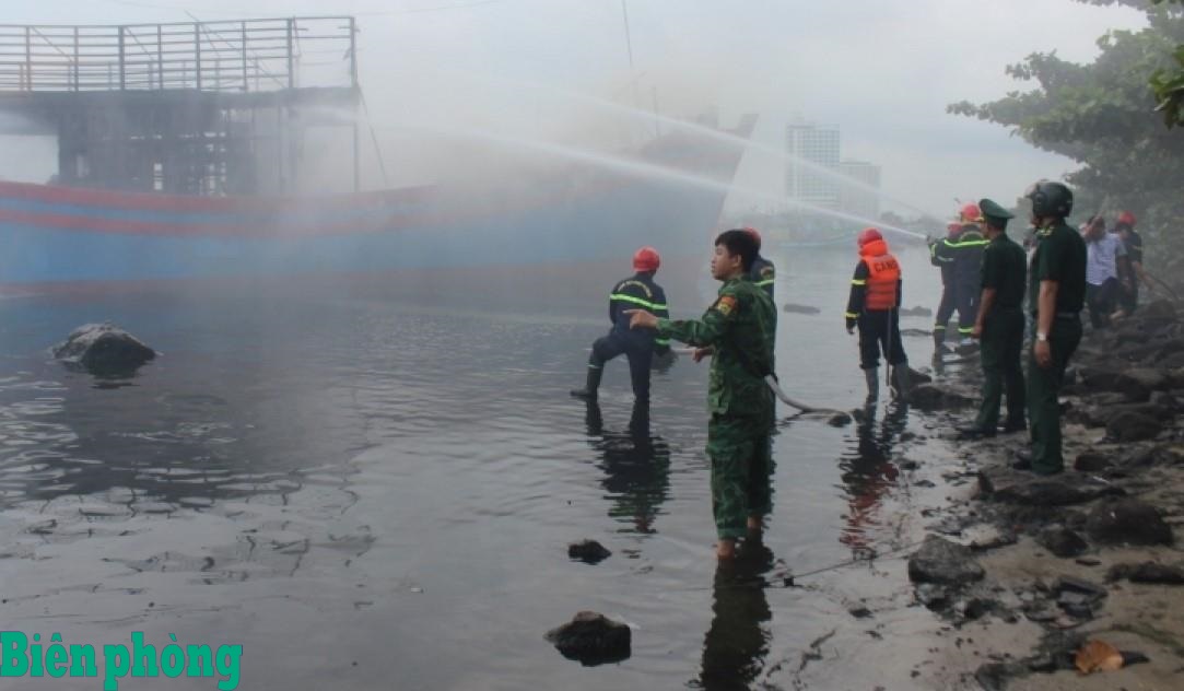 Cán bộ Bộ đội Biên phòng thành phố Đà Nẵng tham gia chữa cháy tàu cá tại Âu thuyền, cảng cá Thọ Quang. Ảnh minh họa: Trúc Hà