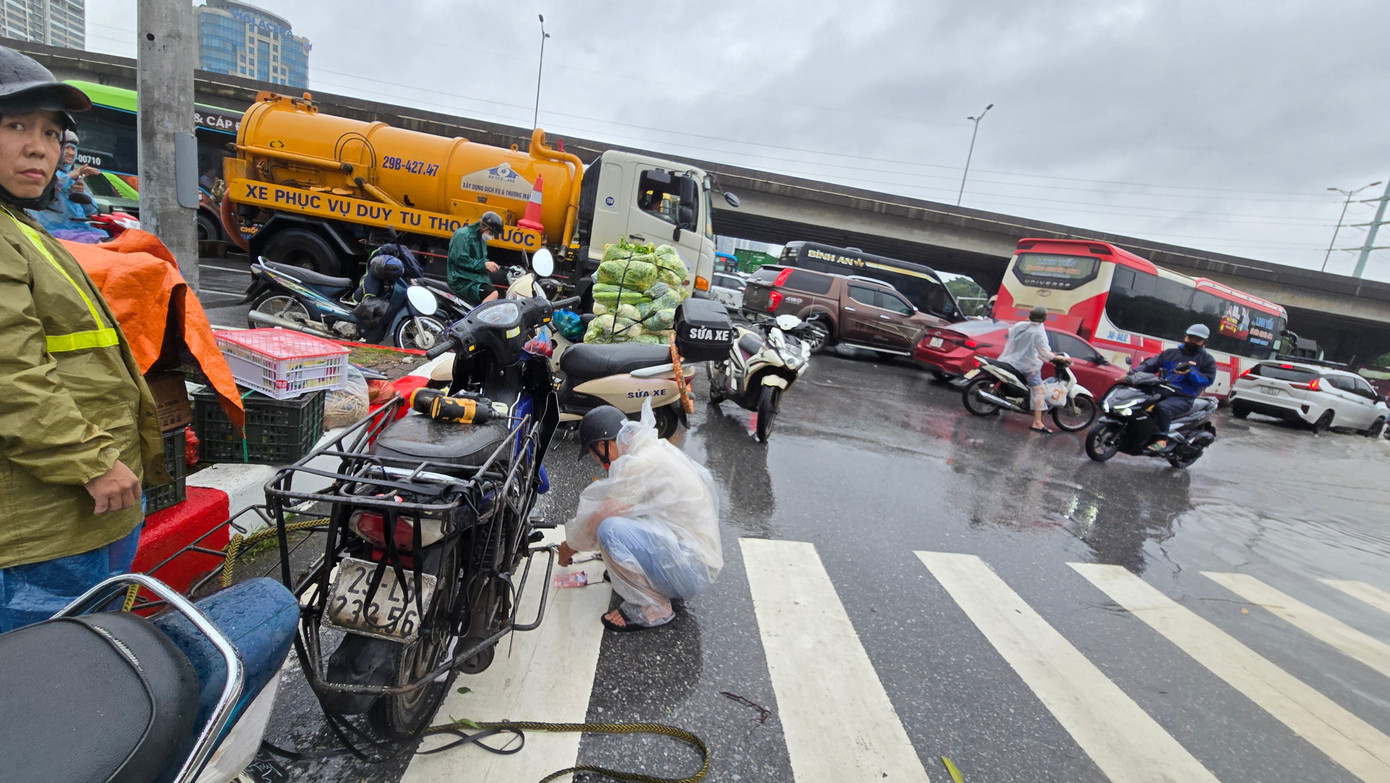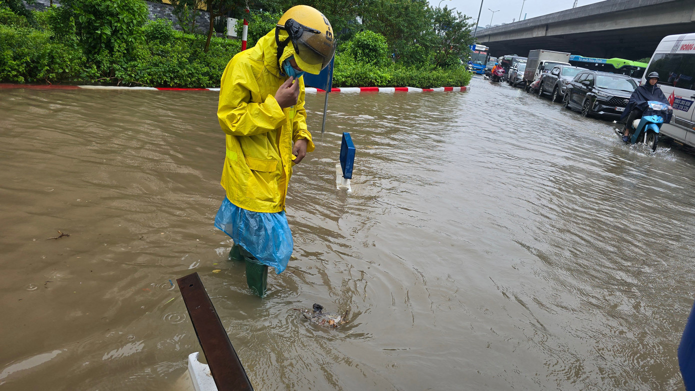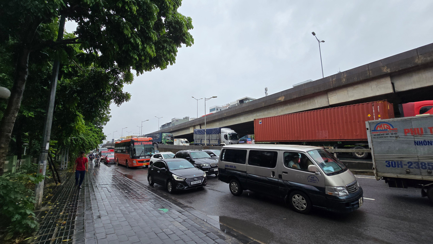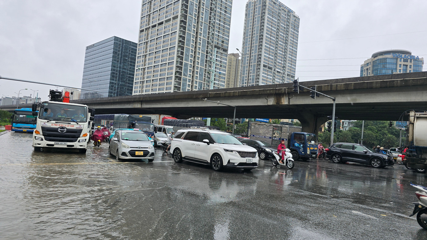 Hiện tại, đường Vành đai 3 trên cao và đường Phạm Hùng đoạn từ ngã tư Lê Văn Lương hướng đi bến xe Mỹ Đình đang tắc dài. Nguyên nhân là do nước ngập sâu đoạn từ Big C trở lên khiến phương tiện di chuyển khó khăn.