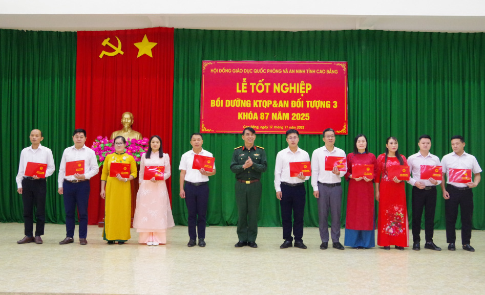 Lãnh đạo Bộ Chỉ huy Quân sự tỉnh trao giấy chứng nhận cho các học viên.