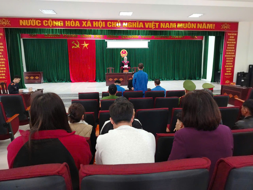 Các bị cáo trong phiên tòa tại Trung tâm văn hóa thôn 9 Ninh Hiệp, xã Phù Đổng, Hà Nội