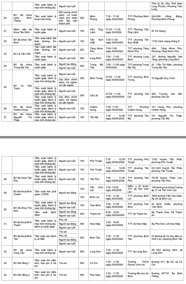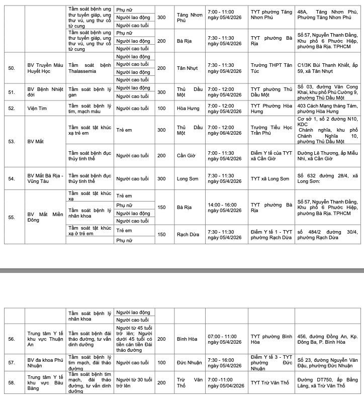 Ngày 3-4, Sở Y tế TPHCM đã công bố 58 bệnh viện, trung tâm y tế tổ chức khám sàng lọc, tầm soát bệnh lý chuyên khoa miễn phí cho người dân tại 64 phường, xã trên địa bàn thành phố.