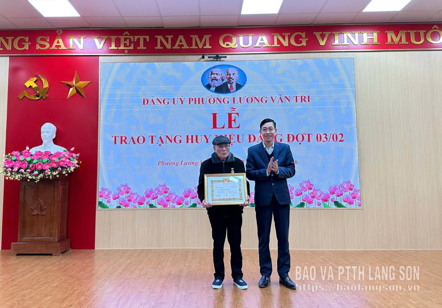 Lãnh đạo Đảng ủy phường Lương Văn Tri trao Huy hiệu Đảng cho đảng viên