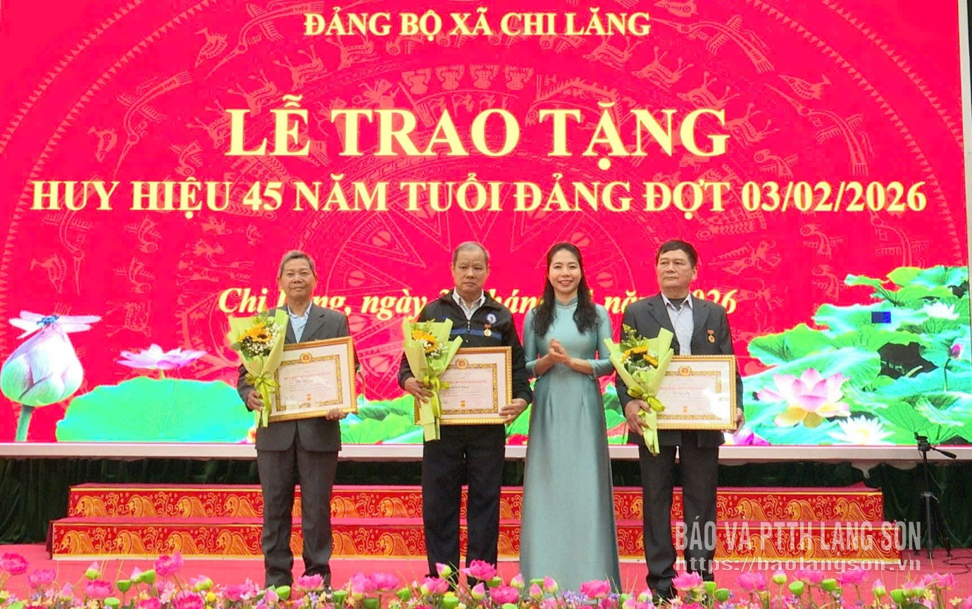 Lãnh đạo Đảng ủy xã Chi Lăng trao Huy hiệu Đảng cho các đảng viên