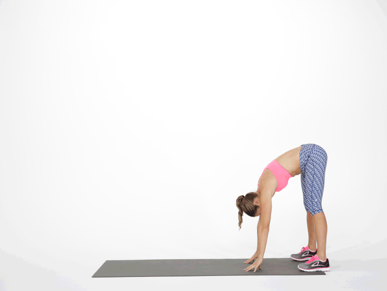 Giữ tư thế plank trong một nhịp thở, sau đó từ từ đưa hai lòng bàn tay về phía bàn chân và trở lại tư thế đứng.