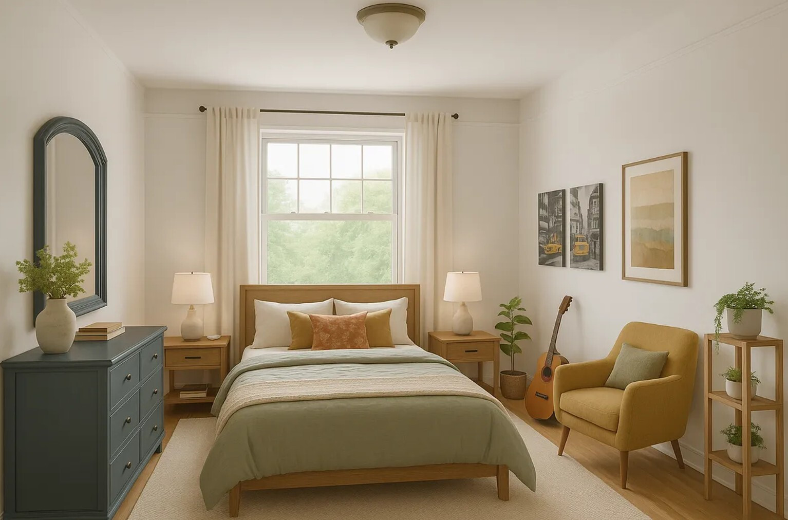 Hình ảnh thiết kế lại phòng ngủ của tôi do AI tạo ra, cho thấy một chiếc giường đặt dưới cửa sổ, một chiếc tủ đựng đồ màu xanh lam ở bên cạnh và các đồ nội thất khác được sắp xếp xung quanh.