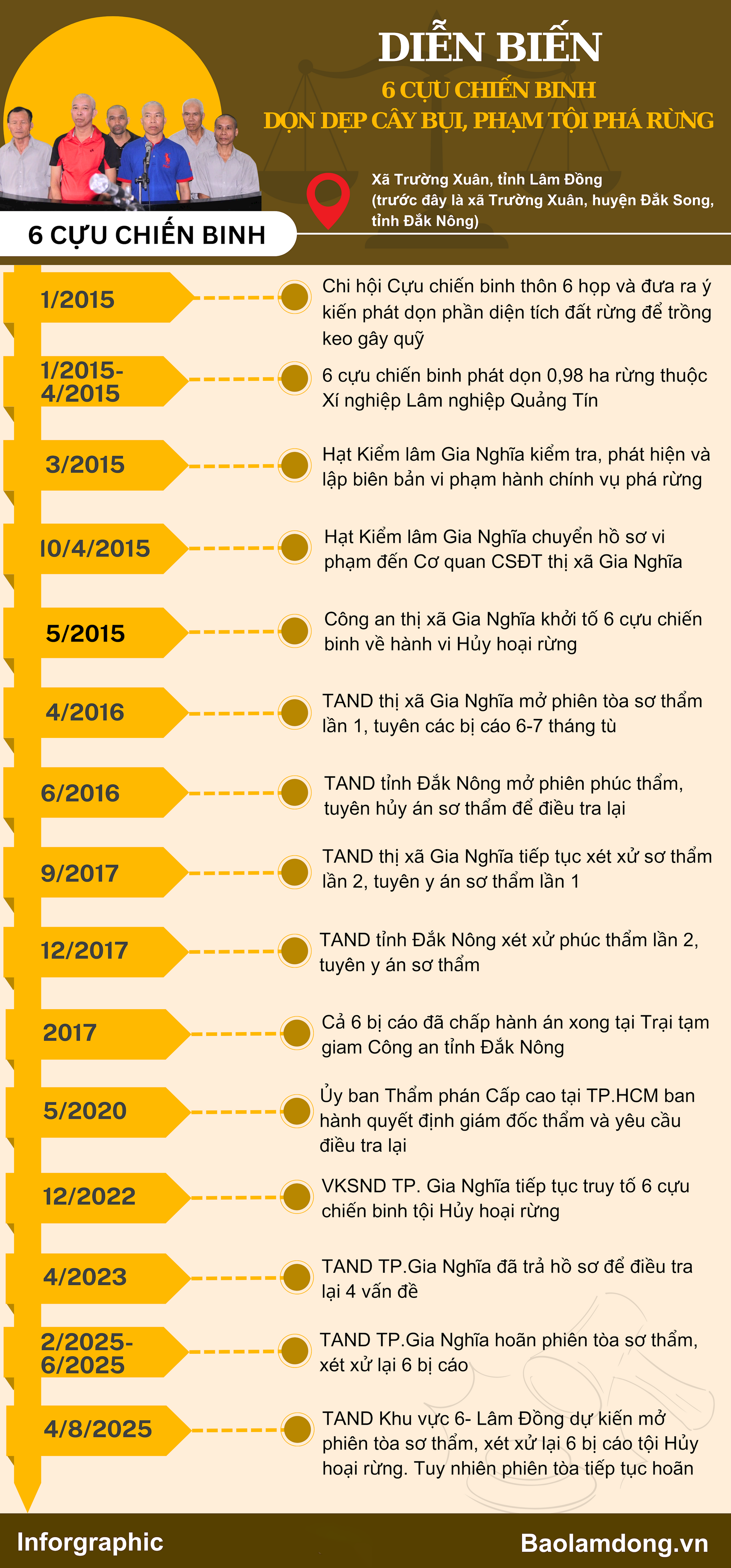 Trong cả hai lần xét xử sơ thẩm trước đó, Tòa án nhân dân TP. Gia Nghĩa (cũ nay là Tòa án nhân dân khu vực 6, tỉnh Lâm Đồng) đều tuyên phạt 6 cựu chiến binh mức án từ 6 - 7 tháng tù.