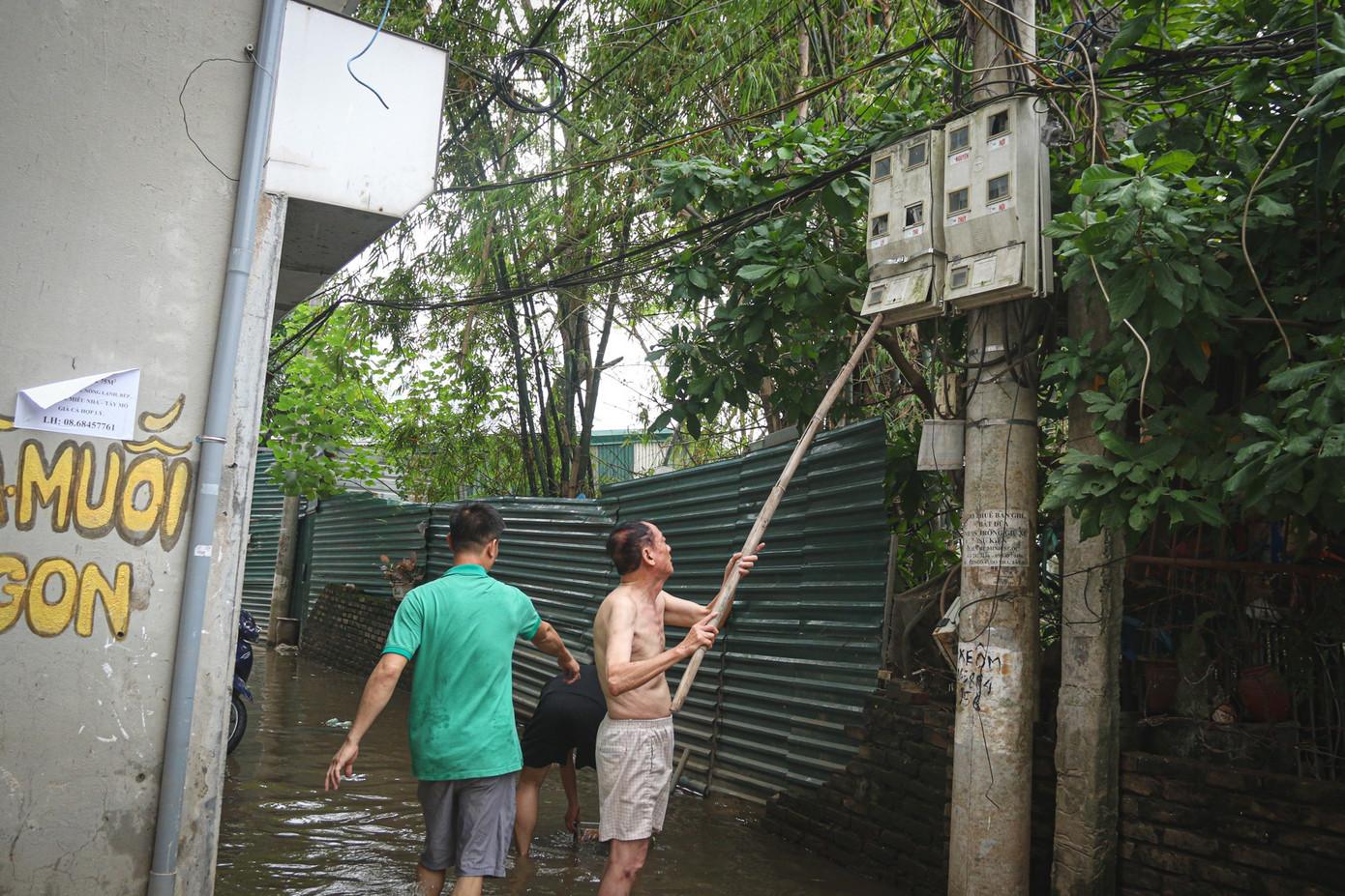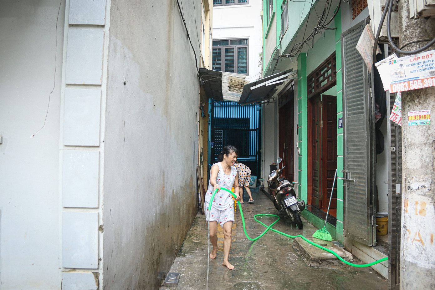 Trên những con ngõ nhỏ, tranh thủ nước ngập rút chậm người dân lội bì bõm trong nước đục, tay xách chổi, xô, giẻ lau dọn dẹp từ trong nhà ra ngõ.