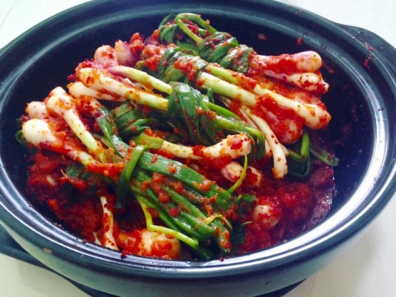 - Tiếp theo, bạn cho 2 thìa nước mắm, 3 thìa ớt bột ,1 muỗng đường, tỏi và gừng, lê, cà rốt, củ cải, ớt sừng bỏ hạt, hành tây say nhuyễn trộn chung lại với nhau để món kim chi hành lá của chúng ta được ngon hơn .