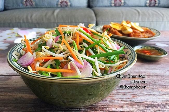 Cho dưa chuột, cà rốt, giá đỗ vào bát tô lớn. Cho bột canh, đường, chanh, tỏi, ớt (băm nhỏ) vào, trộn đều. Khi ăn thêm rau kinh giới hoặc rau mùi.