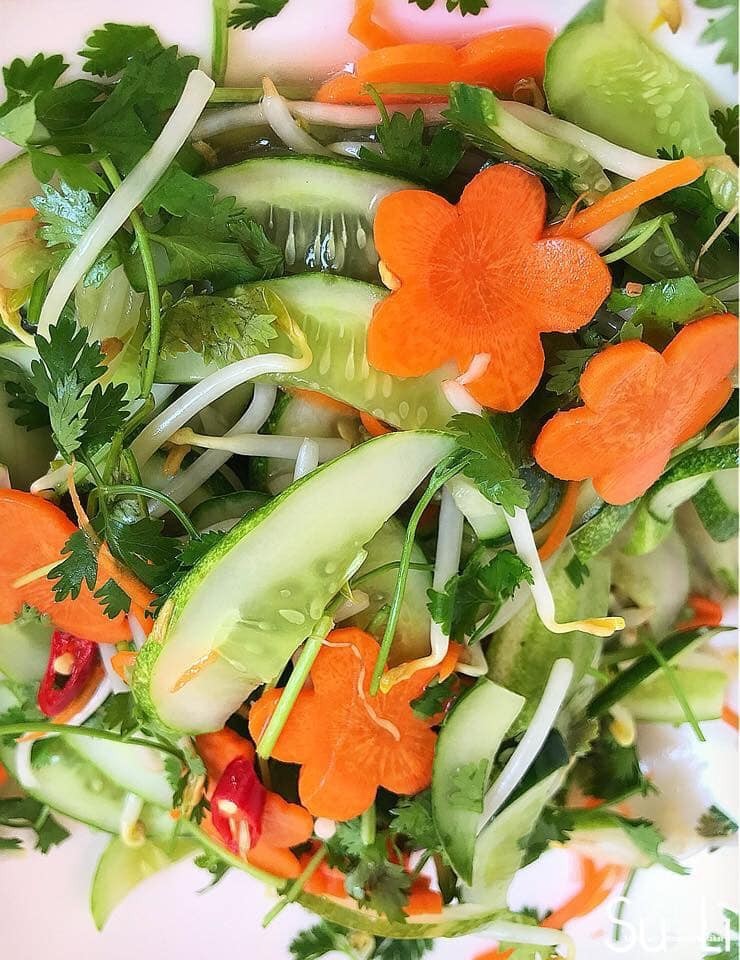 Dưa chuột, giá đỗ, cà rốt, tỏi, ớt, chanh, đường, bột canh, kinh giới hoặc rau mùi