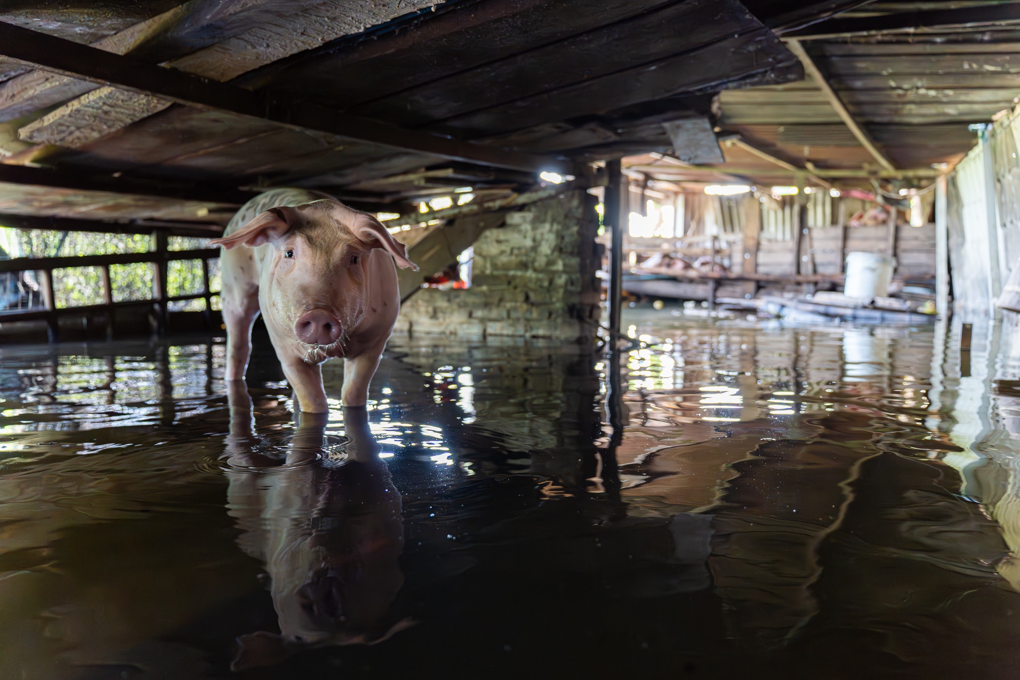 Chuồng trại gần như ngập hoàn toàn, vật nuôi và thú cưng bị bỏ lại khi chủ di tản. Nhiều chủ gia đình cho biết cứ mỗi ngày sẽ quay lại nơi sinh sống để cho các con vật ăn, kiểm tra tình trạng an toàn, rồi lại tiếp tục về nơi tránh trú an toàn.
