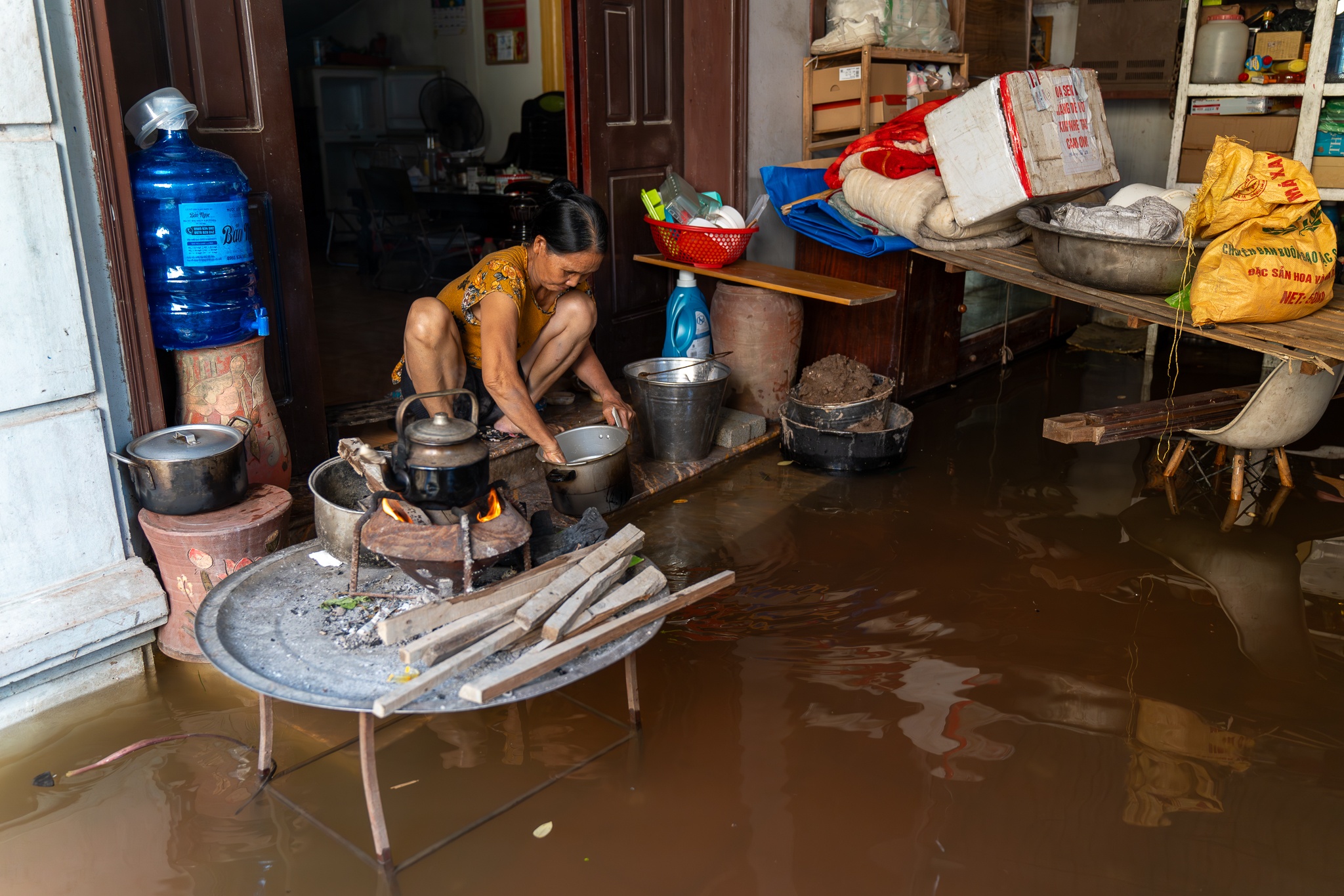 Người dân tại ngách 6/153 Miêu Nha phải nấu bếp củi giữa cảnh mất nước, mất điện, nước ngập bao quanh.