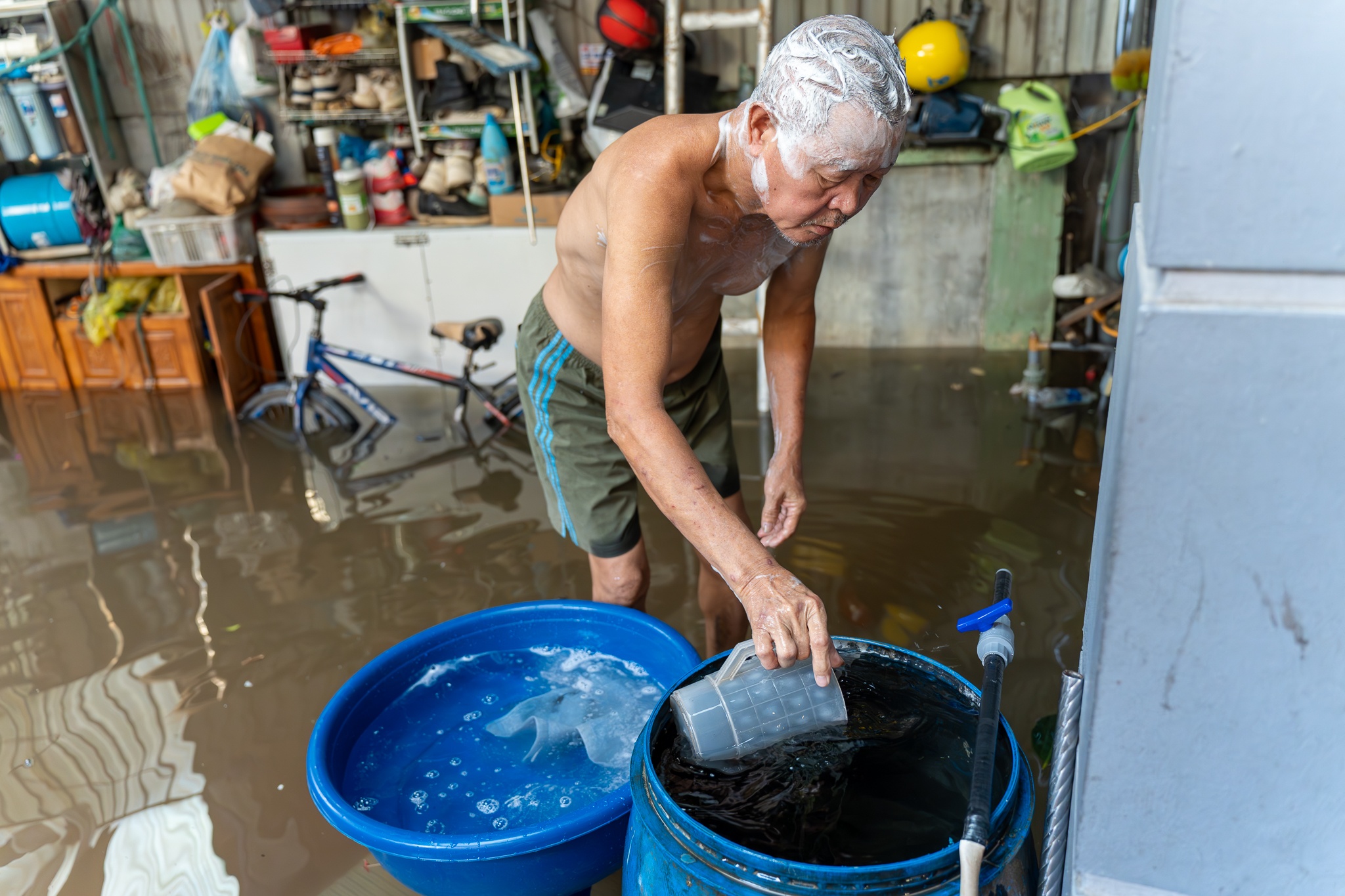 Ông Phạm Huy Bốn (70 tuổi, ngách 6/177 Miêu Nha) phải dùng nước mưa hứng để sinh hoạt trong suốt 5 ngày vừa qua.